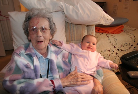 This is Great-Grandma Janet holding 3-month-old Ruby.