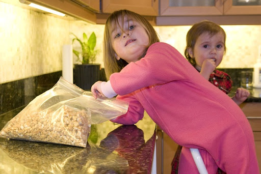 Alli and Ruby have enjoyed their rations of the goodies. Ruby likes to eat the popcorn with a fork. Alli likes to eat it by the fistful.