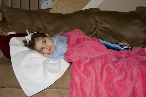 Alli spent Thursday resting on the couch with a bucket nearby. She was sad that she missed her cupcake day.