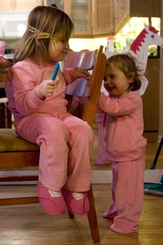 Alli had a rockin' Valentine's Day party at her school yesterday. Ruby came along for the celebration. The Valentine's festivities included a non-uniform day, so Alli got to wear whatever she wanted to school. She wore the pink velour outfit from Grandma with several bracelets, a necklace, heart-patterned flip-flops, heart sunglasses, and her sparkly red tote bag. (I am kicking myself now for not getting a better picture of the whole ensemble).