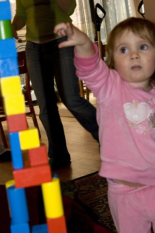 Ruby likes to build with blocks.  And she LOVES to destroy block buildings.   Ruby is our little chatterbox.  She says funny things like "Follow me!" and "What you doing?" and "More chocolate please."  She calls Alli's unicorn a "cornicorn."  She picks up new words daily.  Today she said "fart"... she was repeating what Alli said.